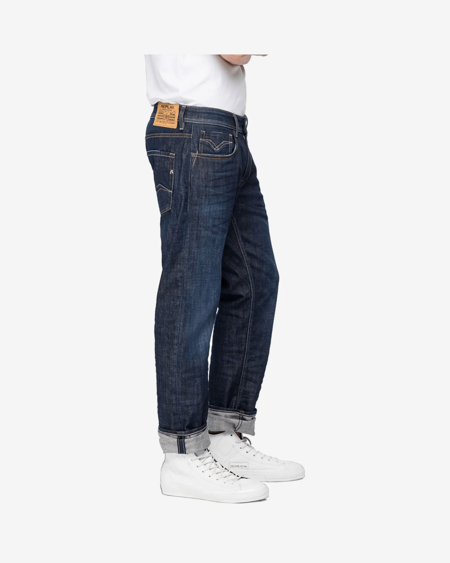 Men’s comfort fit jeans in 11,5 oz indigo stretch denim with a dark wash tone, regular waist and straight leg, lightly sandpapered whiskers and used areas, light aged brushing giving soft contrasts on used areas and final 3D on mannequin. Five pockets, coin pocket and back pockets with iconic gull stitching, R-shaped embroidery on the back, label with REPLAY logo on the waistband, zip and button fly.
