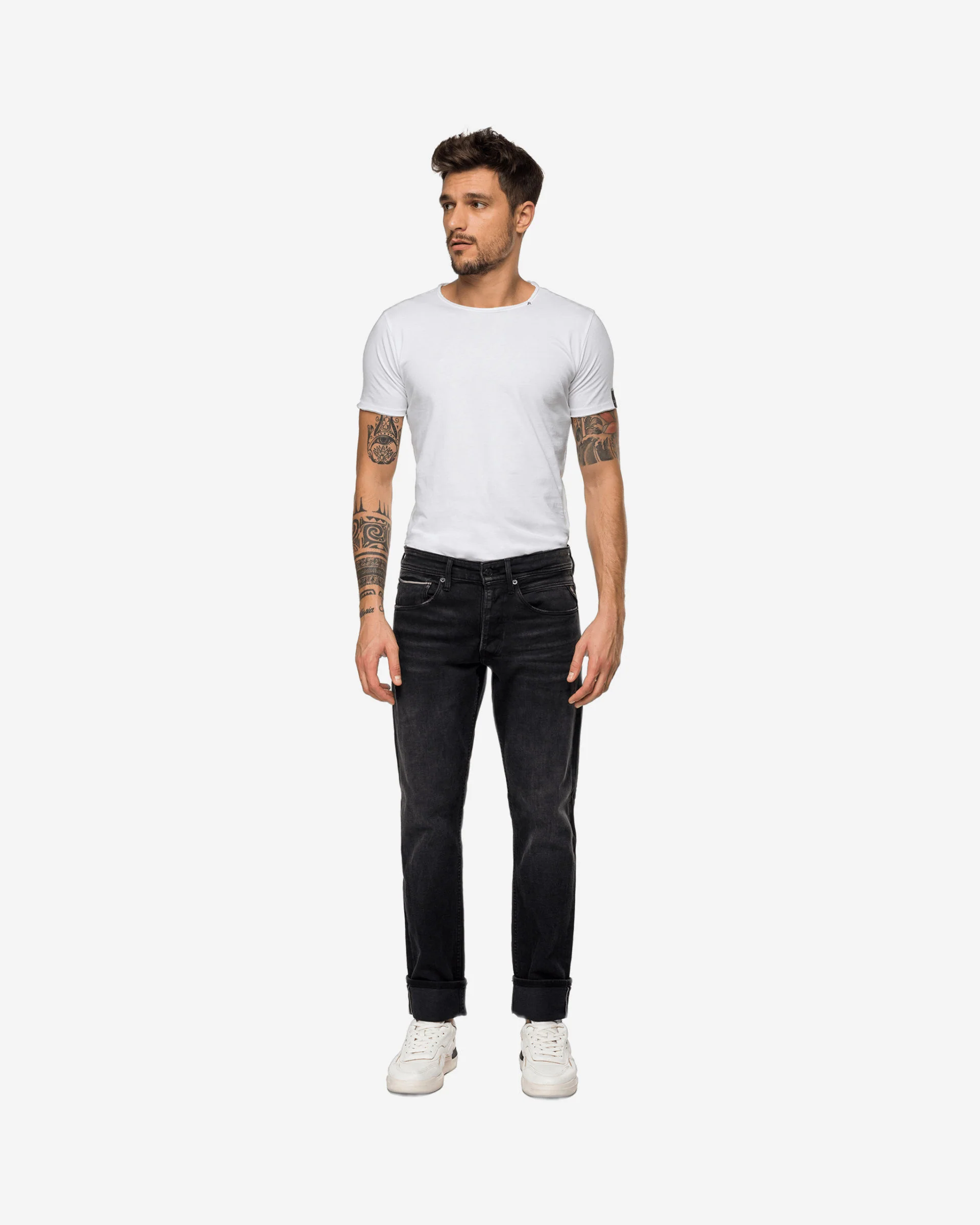Men’s slim fit jeans in 10 oz black stretch selvedge denim with a dark wash tone, whiskers and used areas made with LASER, aged brushing on used areas and final dry on 3D mannequin. Regular waist and slim leg, five pockets, triangle-shaped small patch with REPLAY writing on the front pocket, back pockets with iconic gull stitching, REPLAY label on the belt loop of the back of the waistband, zip and button fly.